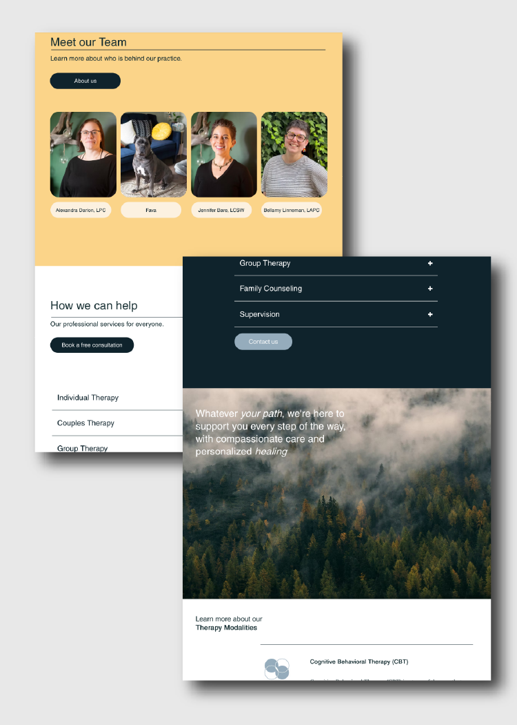 I redesigned the website for Alexandra R. Darion, a licensed professional counselor based in Huntingdon Valley, PA, creating a clean, modern platform that reflects her approachable, client-centered practice. Inspired by a dandelion photo I selected—echoing the flower featured in her existing logo—I developed a soft, nature-based color palette that brings warmth and cohesion to the site.
